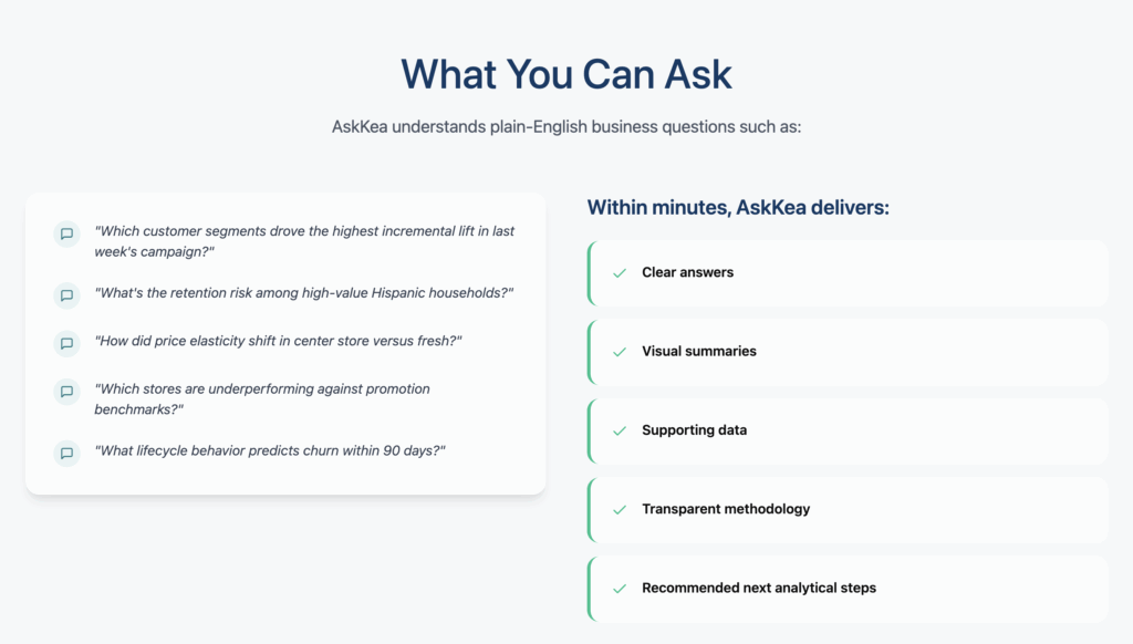 “I have been experimenting with AskKea recently and it is an absolute game-changer for retailers. Not only will they be able to better understand their sales and rewards data, with AskKea, they can make the data highly actionable.”